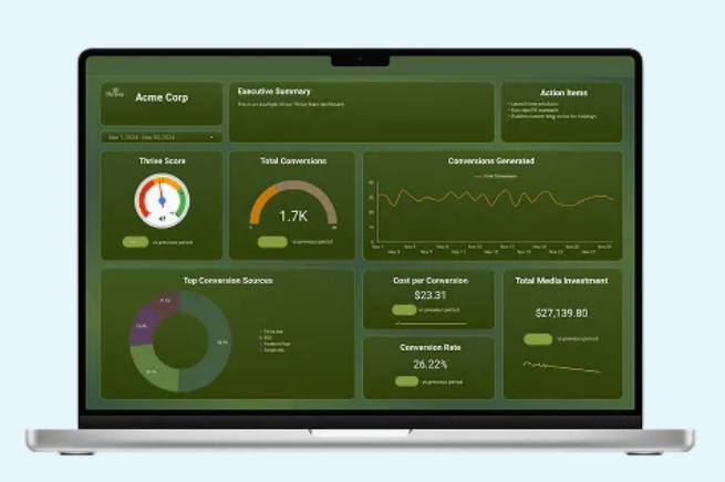 Gain visibility into your online performance with Thrive Stats, our proprietary reporting solution. Beyond tracking performance metrics, it transforms complex marketing data into actionable intelligence. Thrive Stats helps you understand your campaign status, why it matters and how we're optimizing for your success.